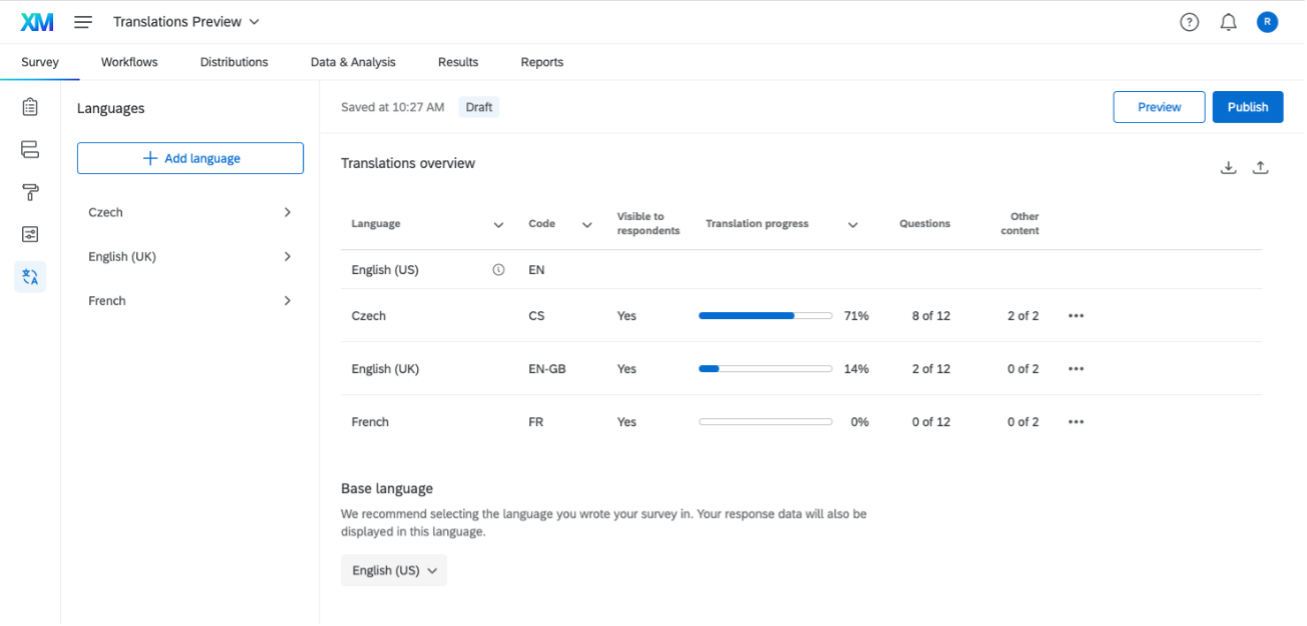 Qualtrics is redesigning the Survey Translations UI for an enhanced experience by making it easier to translate survey projects to meet the needs of global audiences. The new Survey Translations Overview page provides a quick, holistic view of the available languages, the status of each, and quick access to next steps.