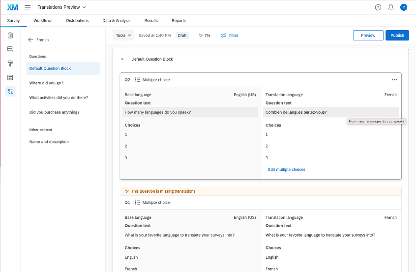 The redesigned survey translation page introduces consistent navigation similar to the survey builder. Translation fields are highlighted to reference base text easily, and the progress percentages and filters are easily visible in the publish bar. New jump navigation and content grouping make it easy to navigate through large surveys.