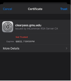 Devices that are not configured to trust the root certificate authority may prompt the user to trust the new certificate when connecting to campus Wi-Fi networks after the update. If you are prompted to trust the Certificate, click on Trust.