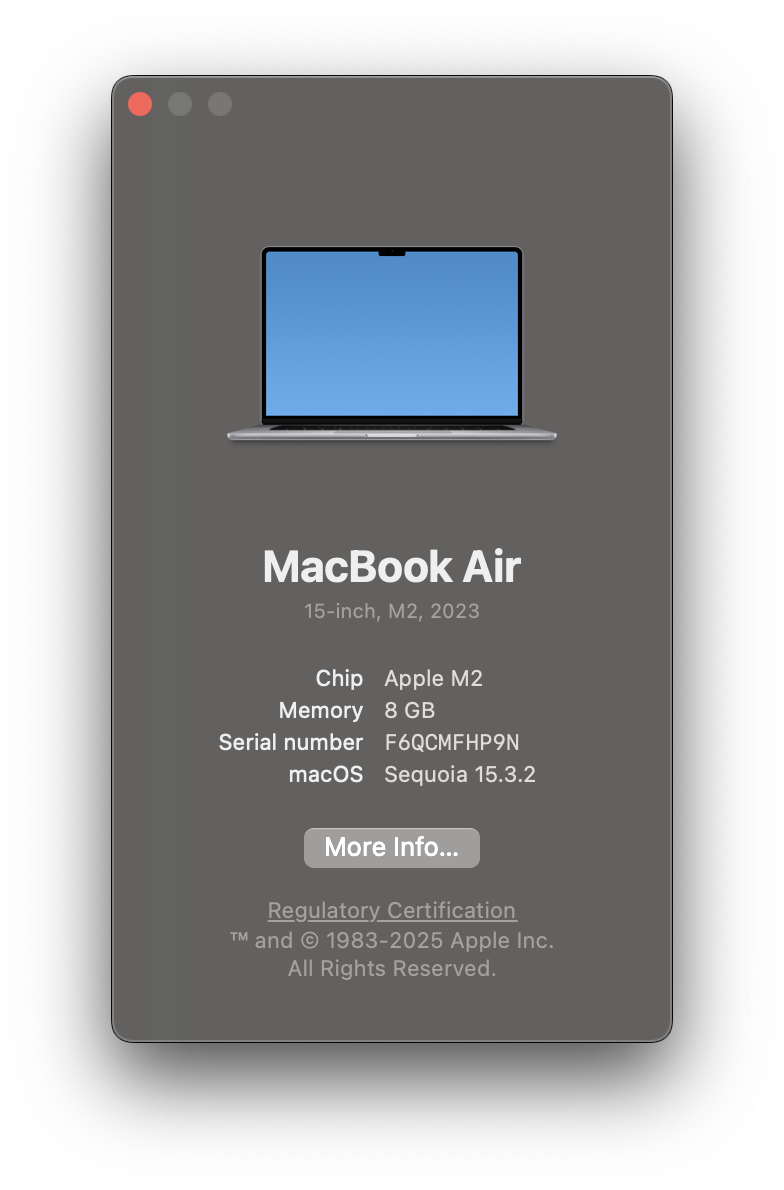 The window that opens might look different from the example shown here, but it always includes the macOS name followed by its version number. If you need to know the build number as well, click the version number to see it.