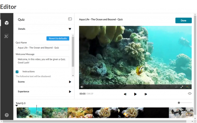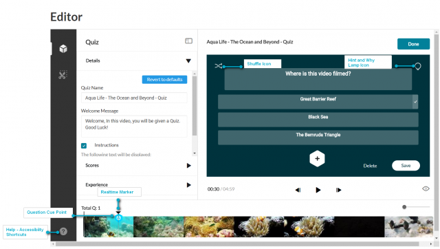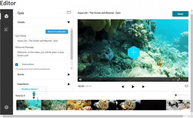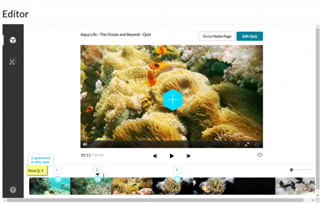 Click Done when you have finished. The Editor screen is displayed with the quiz questions displayed as cue points on the timeline. In this example, the quiz has 3 questions. The total number of questions is also indicated on top of the timeline.