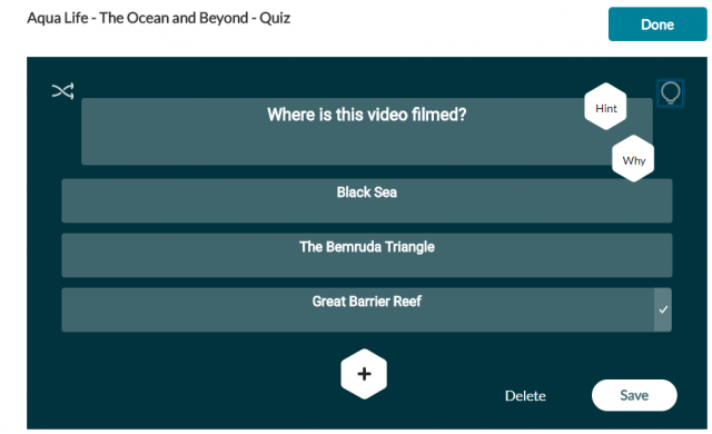To delete an answer, click on the x near the answer. The correct answer cannot be deleted, only modified. Click Save to save the question or Delete to delete the question. The question is saved with the question indicator on the timeline.