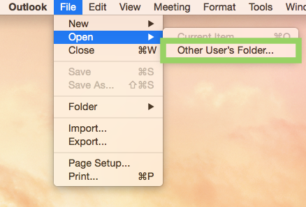 On Outlook’s File menu, select Open, then select Other User’s Folder.