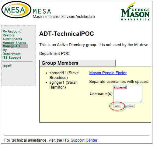 Enter the username of the employee that you wish to add as a Technical Point of Contact. Select Add.