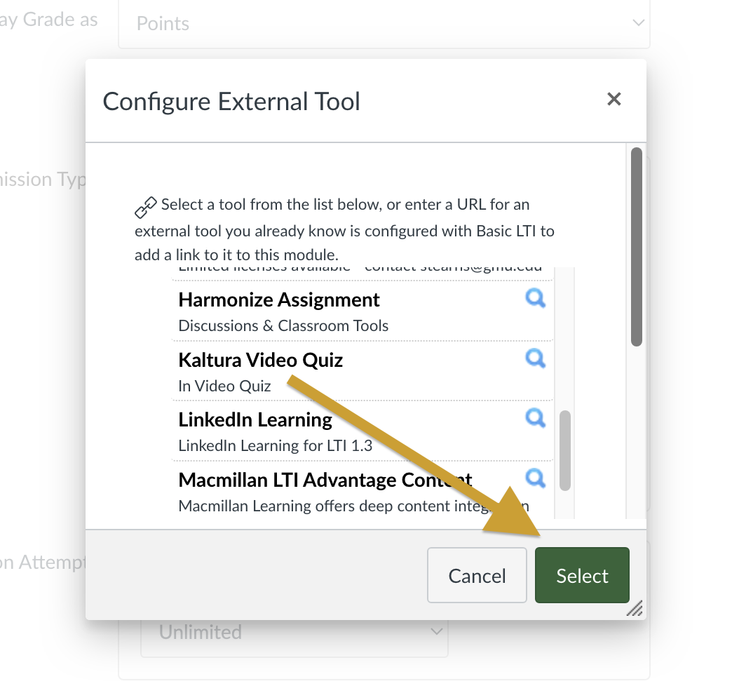 Note: You must create a Kaltura Video Quiz in your MyMedia before adding it to a Canvas Assignment. For more information see: How Do I Create and Edit Interactive Video Quizzes in Kaltura?
