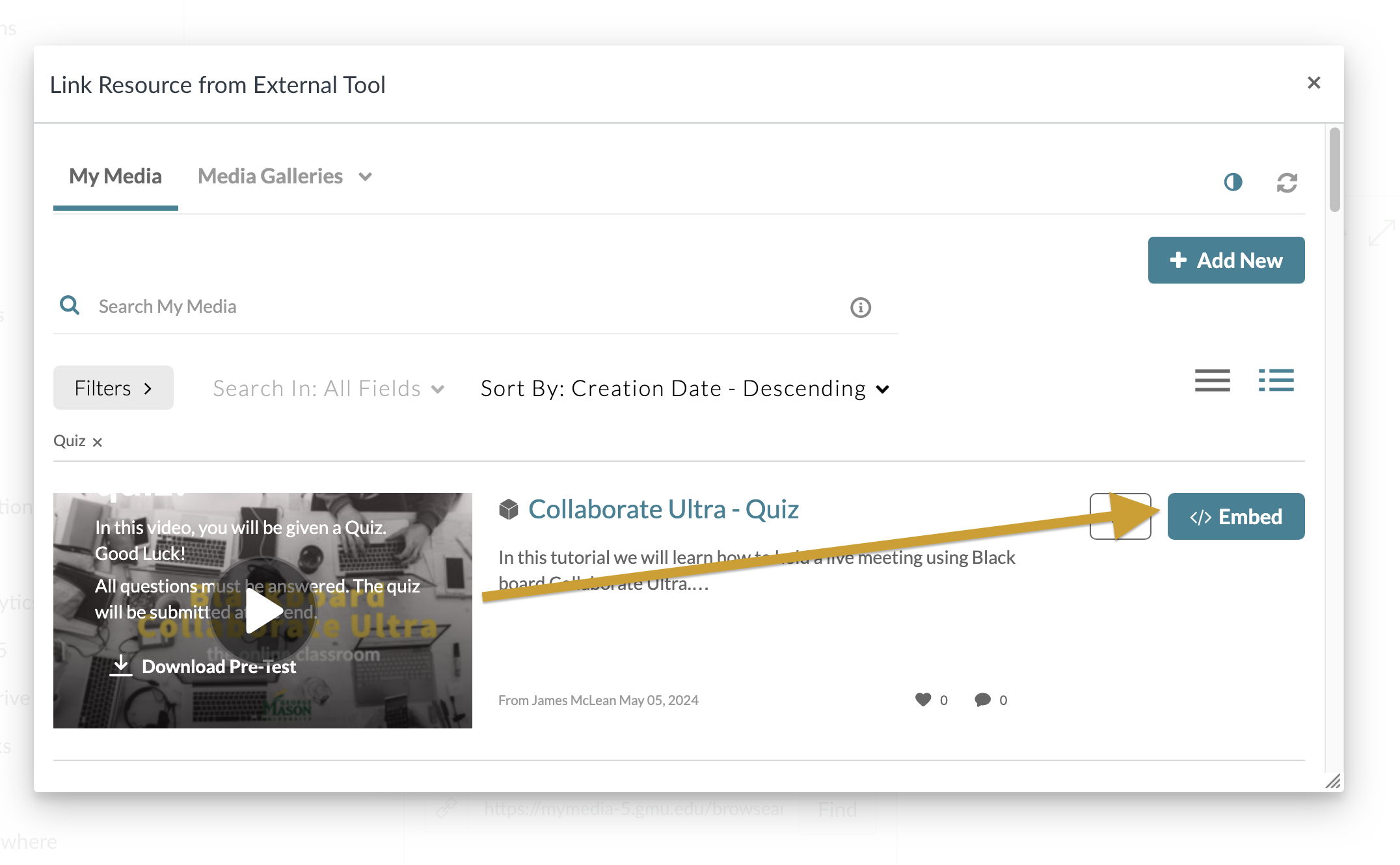 Click Embed to the right of the Kaltura Video Quiz