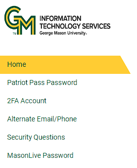 On the Patriot Pass Password Management homepage, click 2FA Account on the left side menu.