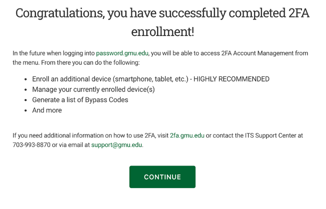 Your initial enrollment is complete. The Enrollment Confirmation page will open. To enroll an additional device or manage other account information, click CONTINUE. For additional instructions, see How to Enroll Additional 2FA Devices and the List of 2FA Authentication Options.