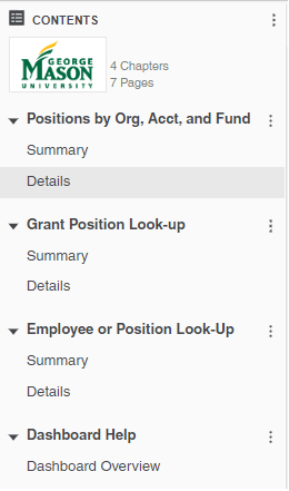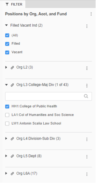 All pages in one chapter share the same Filter panel. This means that making a filter selection on the Filter panel, for example setting the Org L3 College-Maj Div filter to “College of Public Health” will cause each of the pages in that chapter to only display values relevant to that college.