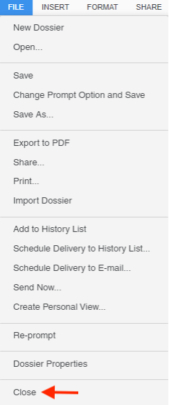 To exit a dossier, click on the ✕ on the menu bar above the Filter panel.