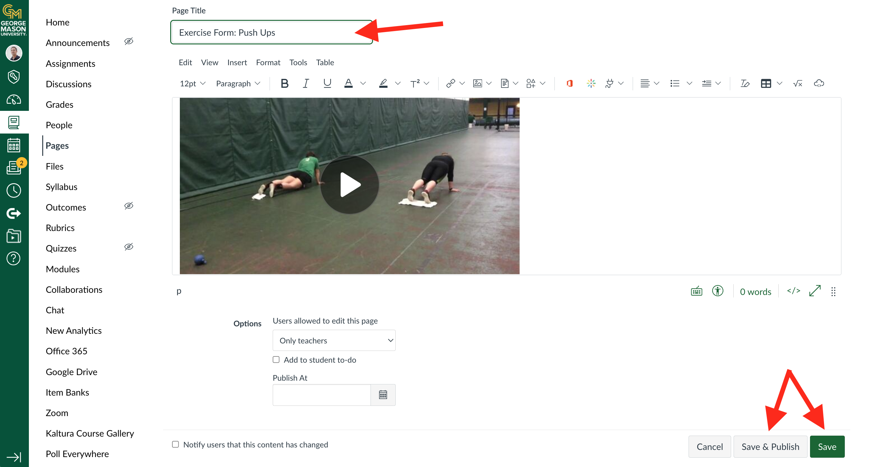Create or navigate to a page (or any other location with a content editor such a discussion post) where you want your video to be placed.