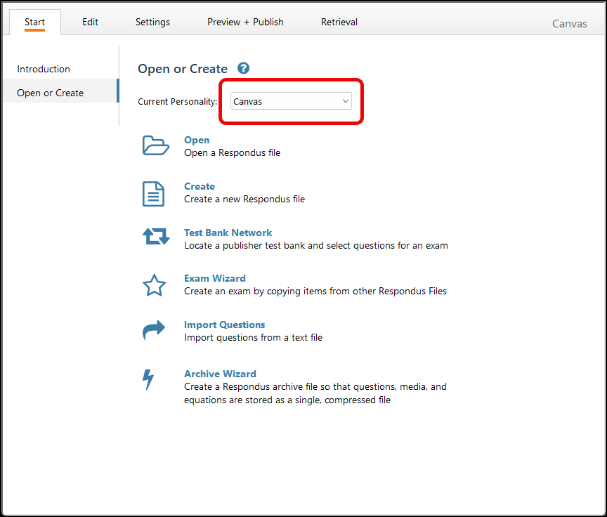 On the Start screen, make sure the current Personality is set to Canvas. You can confirm this by checking the Canvas label in the top-right corner.