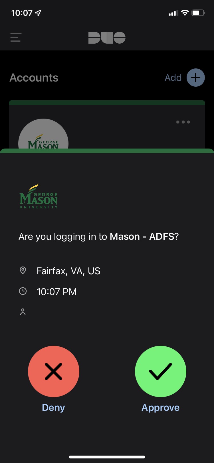Example (Push) – If you use Duo Push, follow the prompt you receive on your device (Note: it may be the same device where you are setting up Outlook Mobile) to approve the request.