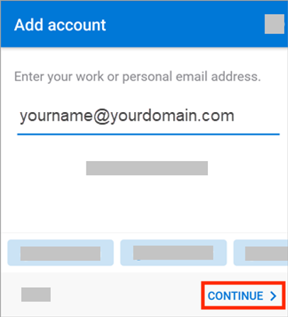 Open the Outlook Mobile App – you will be prompted to add the account (Note: If Outlook displays an account you do not want to add, like your Gmail account, uncheck it and click Skip to continue). Enter your full Mason email address, including the @gmu.edu, and click Continue.