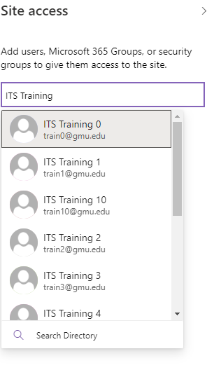 In the box above, enter the name of the M365 or Security Group that you will be using for access control. As you type in the name, a drop down of matching group names will be displayed. Click on the group name you want to use for access control.