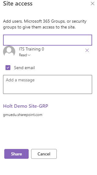 As the sharing is determined, you have the option to send the group members an email notifying them of their access. The content of the notification should be entered into the box provided. If a notification email should not be sent, uncheck the Send email box.