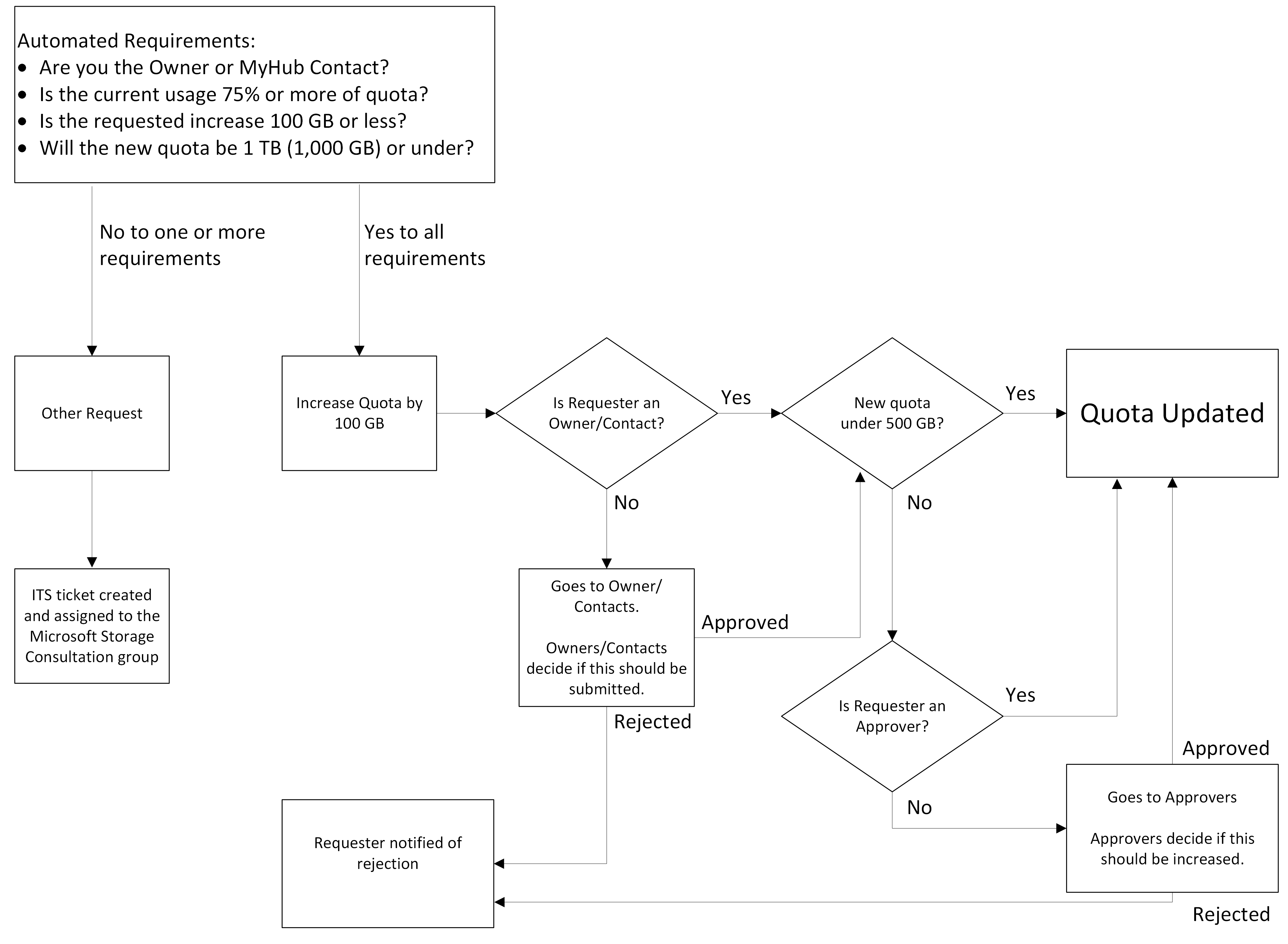 When the new storage quota is over 500 GB, the request will require departmental approval. Departmental approvers should review the information provided in the questionnaire and consult with the individual or workspace Owners to determine if Microsoft is a suitable environment for the data, assist with cleanup, and then approve or reject the request. During this stage, only one departmental approver is required to approve or reject the request. The requester (and other departmental approvers) will be notified of the final status of the request via MyHub. Departmental approvals have a 30-day limit to take action and will receive email reminders. Failure to approve or reject the request by the departmental approvers will result in auto-rejection. Requesters will be notified via MyHub of the overdue task being rejected.