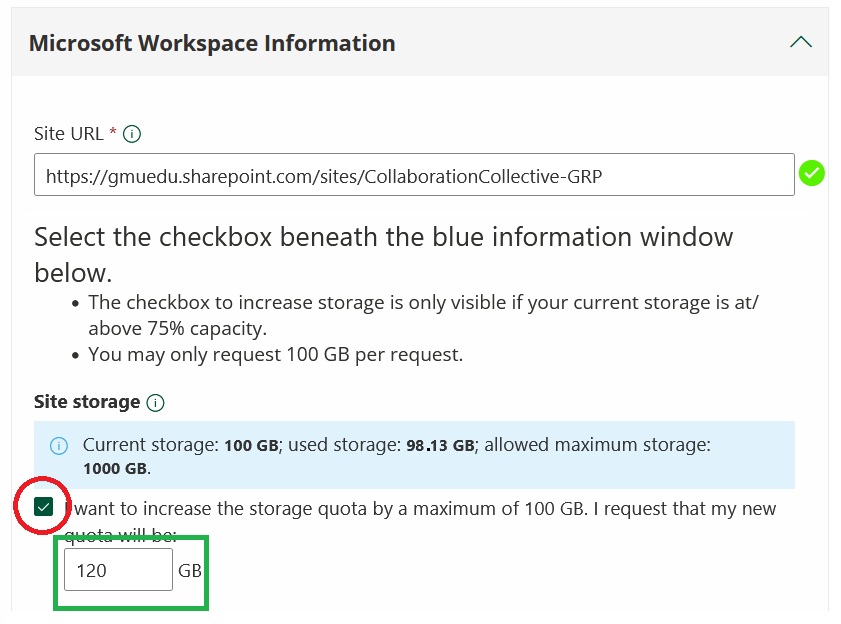 - The automated workflow will not work if the current usage is under the 75% quota or if the requested amount is over 100 GB, or the new quota is over 1 TB (1,000 GB).