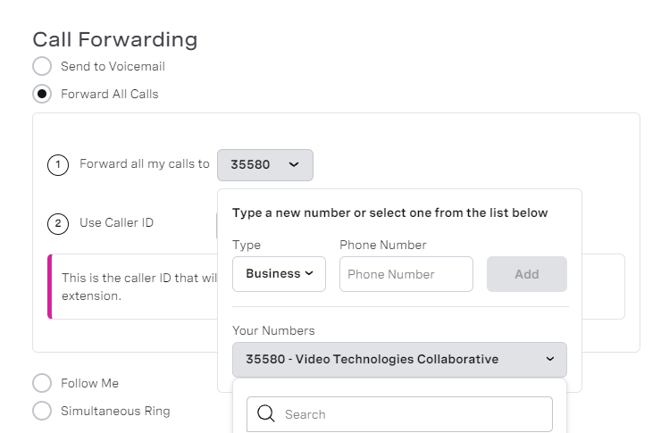 - Under the Caller ID option, you will select a number from the drop-down menu. This is the number that will appear on your phone when calls are forwarded from your extension. It is recommended that you select “Originating Number” (the number of the caller), or your extension.
