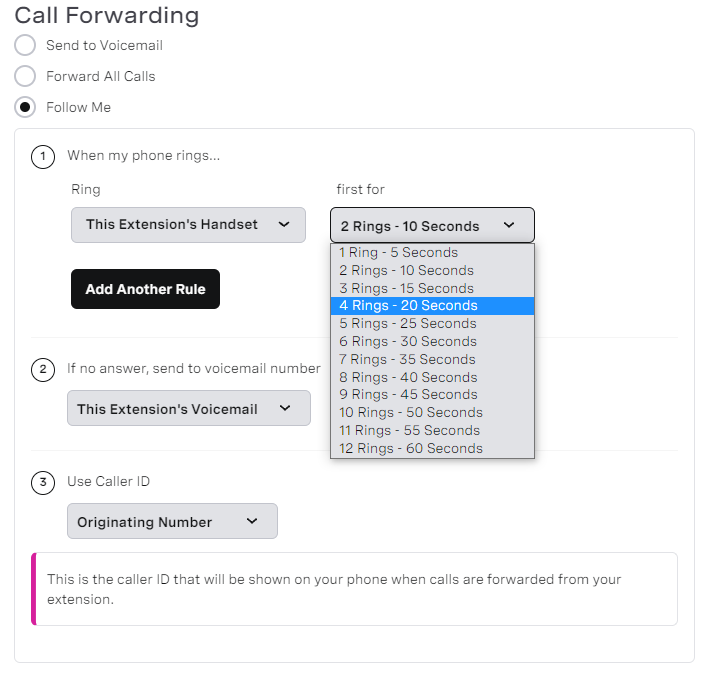 Note: If you are forwarding calls to a cell phone or other external number, to ensure the call flow works properly, the number of rings set should not exceed 4 rings.