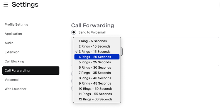When voicemail is selected you will configure the number of rings and ring time that occurs before a call is sent to voicemail. Additional voicemail settings can be found under the “Voicemail” section of Settings.For more, see Call Management Settings in the Vonage Desktop App (Softphone) Guide.