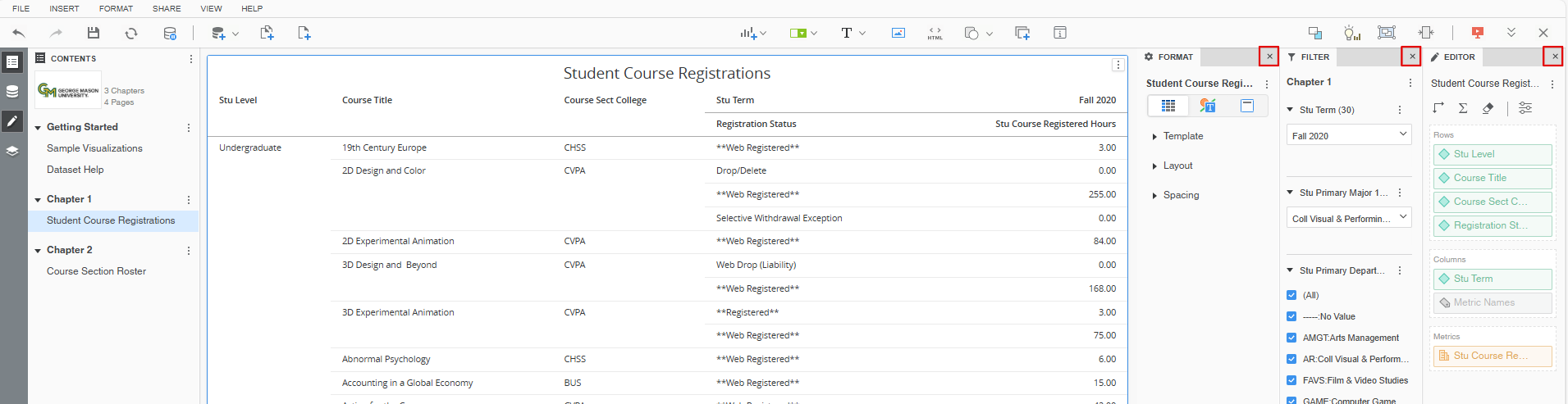 Note: To close only the Editor and/or the Format panels while keeping the Filter Panel open, you must individually drag each panel out of the staggered layout. Once separated, click the X button in the top-right corner of each panel to close it.