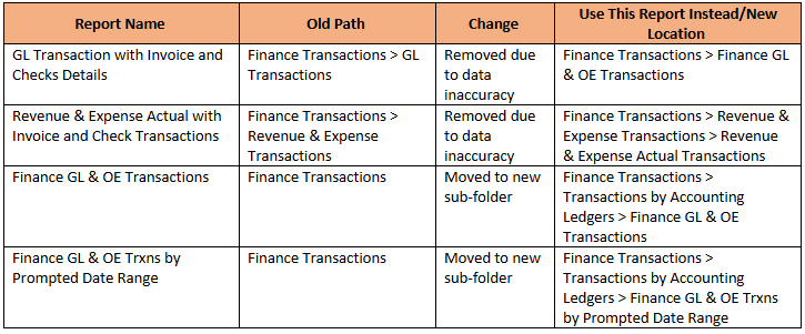 - Finance GL & OE Transactions – moved to new sub-folder (Finance Transactions\Transactions by Accounting Ledgers)